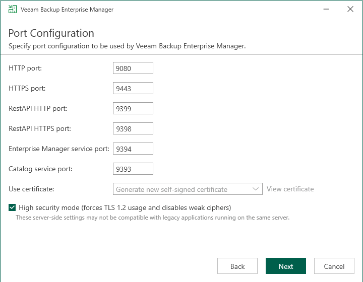 28.Select High security mode (force TLS 1.2 usage and disables weak ciphers) and click Next.
