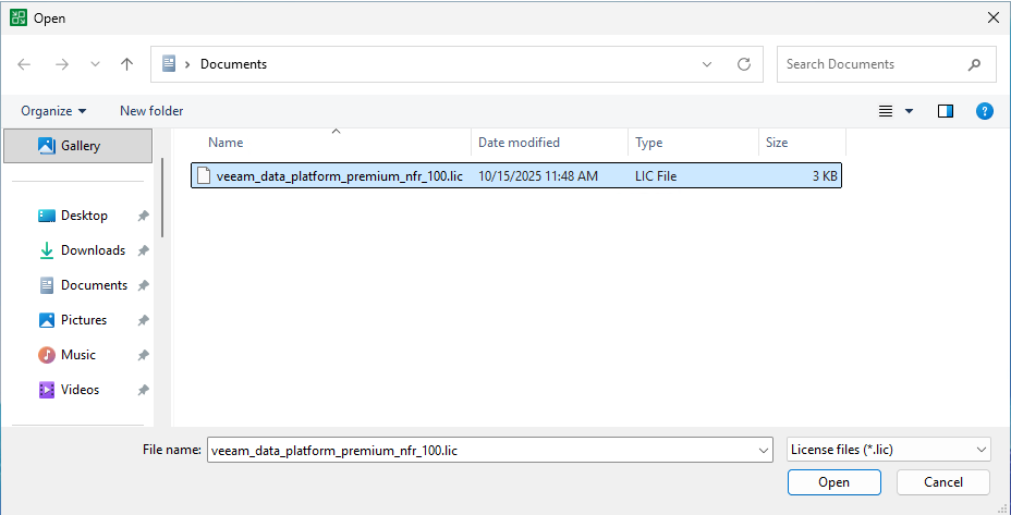 11.Select a valid Veeam Backup Enterprise Manager v13 license file and click Open.