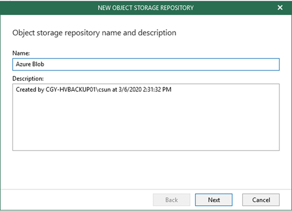 On the Object storage repository name and description page, type Azure Blob as Object storage repository name, click Next.