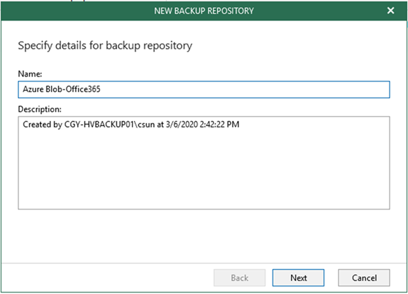 On the Specify details for backup repository page, type Azure Blob-Office365 as repository Name, click Next.